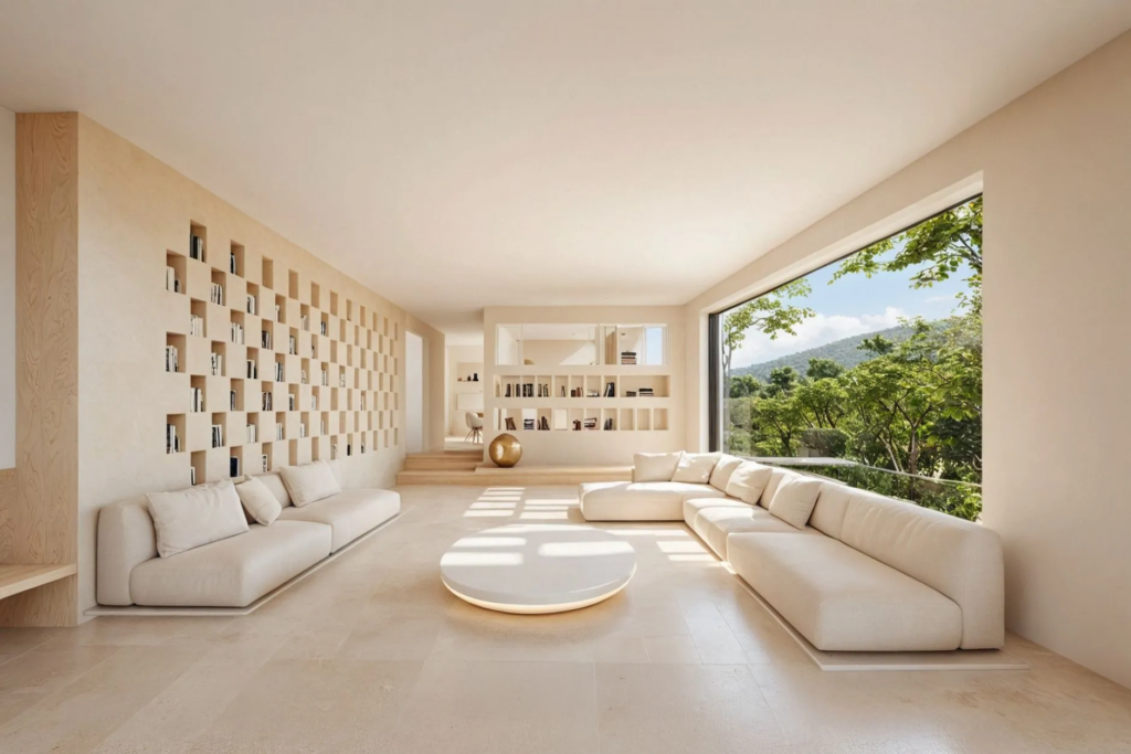 En la planta baja encontramos la zona de día con la sala de estar-comedor, la cocina, dos baños y una habitación doble independiente. En la primera planta hay tres habitaciones dobles más y dos baños, uno de ellos dentro de la suite, que cuenta con vestidor y terraza. Finalmente, una zona central de despacho abierto configura el espacio común de la primera planta y la conecta con la planta baja a través de la escalera.