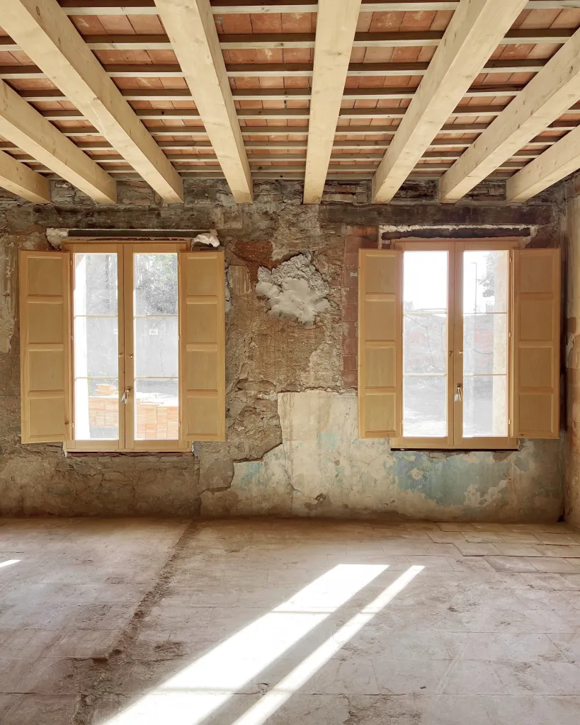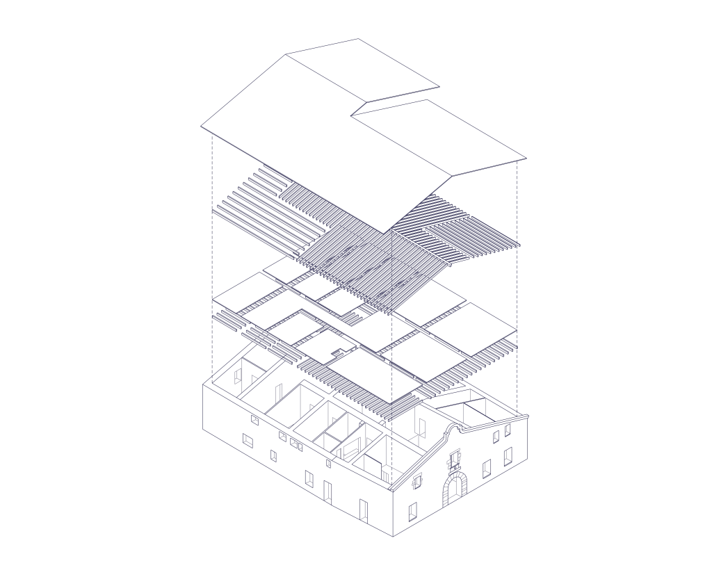 La intervención en la Masía de Can Boada, edificio del siglo XV catalogado por su valor histórico en Terrassa, se centra en su consolidación estructural y adecuación general. Se renueva la cubierta con una estructura ligera de madera y se sustituyen las carpinterías, respetando al máximo los elementos patrimoniales como pavimentos, escaleras y techos originales. La intervención incluye derribos puntuales y una nueva valla perimetral. Dada su condición protegida, se descarta alterar la cimentación, optando por soluciones ligeras que preservan la autenticidad constructiva y permiten un uso programático flexible en el futuro.